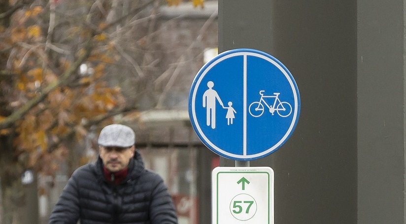 - Soms staat er ook een bord dat aanduidt dat fietsers aan de ene kant moeten rijden en voetgangers aan de ander moeten stappen. Zowel op het bord als op de straat zie je een scheidingslijn (kan ook door een andere kleur of ander materiaal op straat) om aan te geven wie waar hoort.