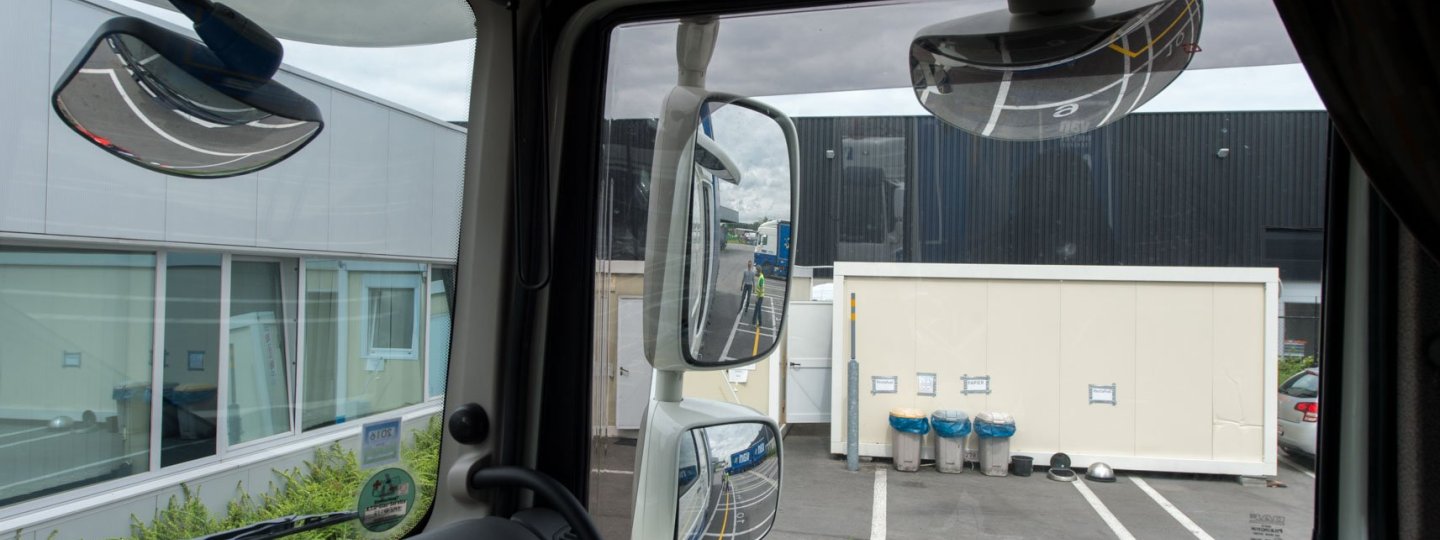 • Toch maken al deze verplichte spiegels niet alles zichtbaar voor de bestuurder. De meeste aanrijdingen gebeuren rechts naast de cabine. Die plaats is met geen enkele spiegel volledig zichtbaar!