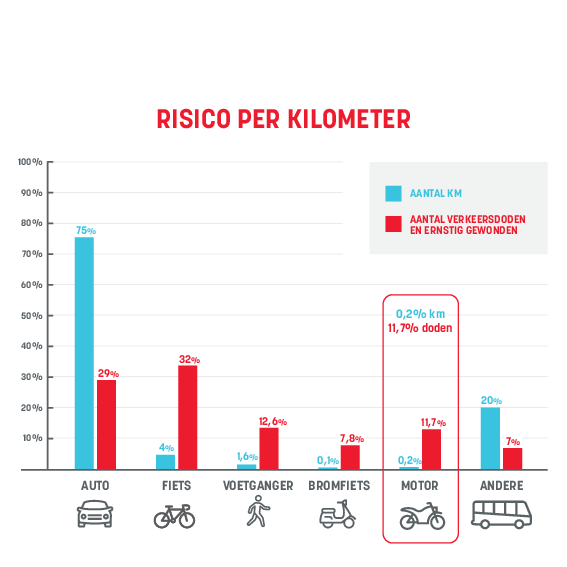 - In 2019 legden de motorrijders 0,2% van alle kilometers af, maar meer dan 11% van de zwaargewonde en dodelijke verkeersslachtoffers waren motorrijders.